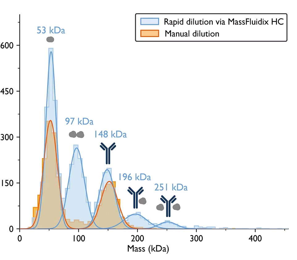 Figure 3. Rapid dilution by MassFluidix HC reveals low-affinity complexes. The IgG antibody was mixed with the soluble domain of the IgG neonatal Fc receptor (FcRn) at a 1:10 ratio (pH 5.0). After manual dilution (shown in orange), peaks corresponding to FcRn monomers and IgG monomers were detected. After rapid dilution with MassFluidix HC (shown in blue), additional peaks corresponding to FcRn dimers and IgG-FcRn complexes with 1:1 and 1:2 stoichiometry were also observed.